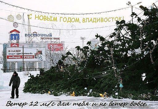 На Новый 2010 год наша мэрия решила всех то ли порадовать, то ли сразить наповал ёлкой за 5 млн. руб. + ещё 5 млн. на её украшение. Народ ходил недоумевал, неужели некуда деньги девать? И вот 30 декабря 2009 за сутки до Нового года случился такой ураган, что вся эта красота свалилась, и на Новый год Было вот что.